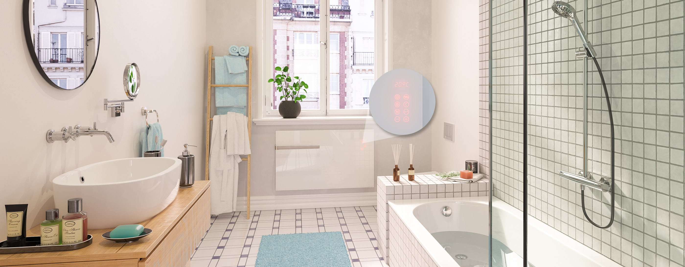 Der InKo Plus wird über das integrierte Touch-Bedienfeld gesteuert. Dieses verfügt über separate Einsteller für Komfort-, Absenk- und Frostschutzbetrieb. Außerdem kann zwischen 4 Betriebsmodi gewählt werden, abhängig von Ihren Bedürfnissen. Der Glasstrahlunsgheizkörper ist so programmiertbar, dass Sie stets zu den von Ihnen gewünschten Tageszeiten eine wohlige Wärme genießen. Mit der Temperaturabsenkung bei Abwesenheit sparen Sie zudem Energiekosten ein. Durch seine kompakte Bauform und die hohe Leistung, eignet sich der InKo Plus Ideal für Räume mit erhöhtem Energiebedarf, wie z.B. Wintergärten und Bäder. Optional kann der InKo Plus auch mit Handtuchbügeln ausgestattet werden.