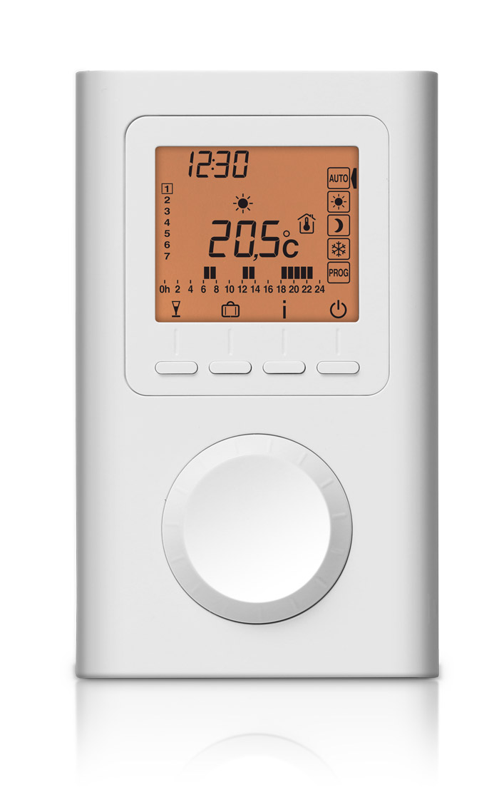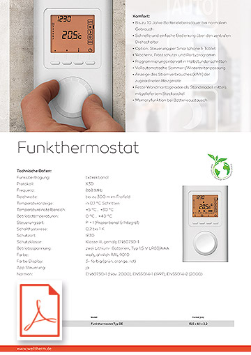 Das Thermostat verfügt über eine Wochen- und Tagesprogrammierung, zusätzlich stehen fünf Betriebsarten zur Verfügung (Komforttempera-tur, Nachtabsenkung, Partyfunktion, Frostschutz und ein Ausschalter).