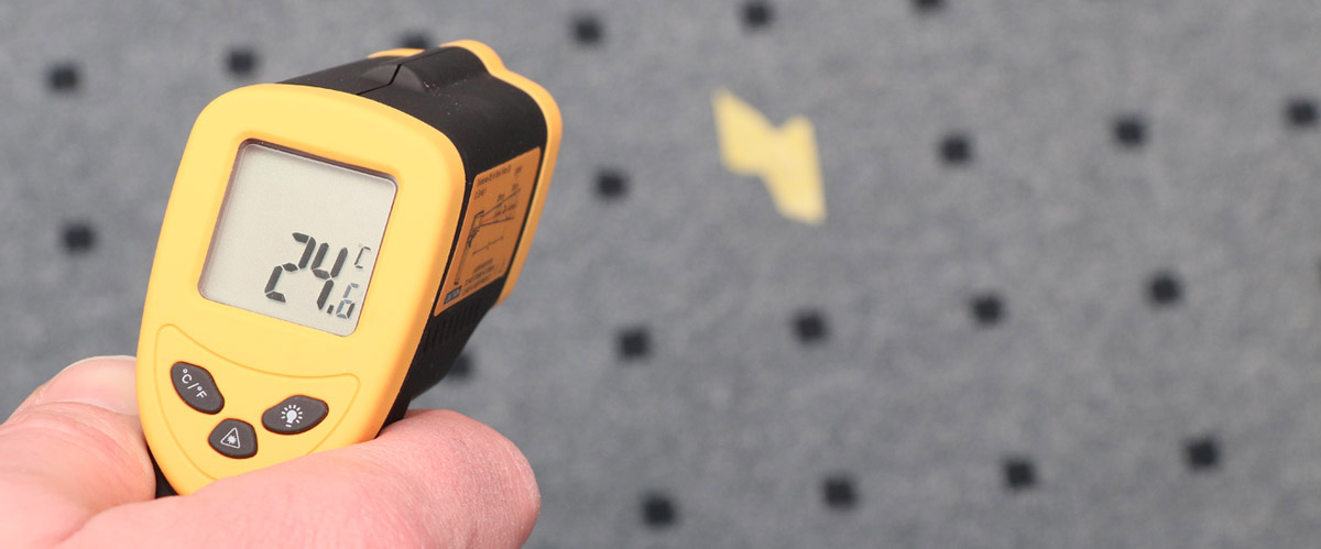 Vor der Installation der Infrarotheizung messe ich die durchschnittliche Bodentemperatur mit einem Infrarotthermometer. In drei Messreihen messe ich an 6 Stellen die Bodentemperatur. Die 18 gemessenen Werte: