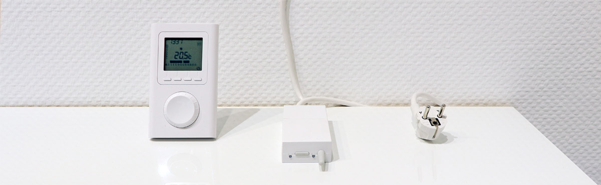 Folglich bestelle ich ein Heizpanel im Format 1,0 x 0,25 m mit 150 Watt Leistungsaufnahme und montiere diese Heizung direkt unter meinen Arbeitstisch mit ausreichend Abstand zu den Knien. Die abgestrahlte Wärme heizt das Areal, auf dem für gewöhnlich meine Füße ruhen. Als elektrische Steuerung kommt eine Kombination aus einer Zeitschaltuhr und einem Steckerthermostat zum Einsatz. So heizt meine neue Untertischheizung nur zu Bürozeiten und nur solange bis die eingestellte Zieltemperatur im „Fußraum“ meines Arbeitsplatzes erreicht ist. Sehr gut!