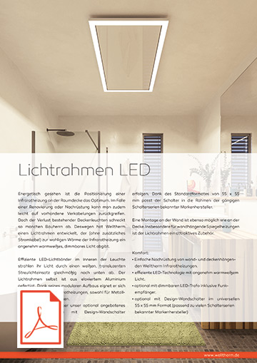 Energetisch gesehen ist die Positionierung einer Infrarotheizung an der Raumdecke das Optimum. Im Falle einer Renovierung oder Nachrüstung kann man zudem leicht auf vorhandene Verkabelungen zurückgreifen. Doch der Verlust bestehender Deckenleuchten schreckt so manchen Bauherrn ab. Deswegen hat Welltherm einen Lichtrahmen entwickelt, der (ohne zusätzliches Stromkabel) zur wohligen Wärme der Infrarotheizung ein angenehm warmweißes, dimmbares Licht abgibt.