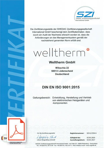 Die Welltherm GmbH hat zu Beginn des Jahres 2017 die Qualitätsmanagement-Zertifizierung nach der neuen weltweit gültigen Norm DIN EN ISO 9001:2015 erhalten. Die Qualitätsmanagement-Norm ISO 9001 ist national und international die meist verbreitete und damit die wichtigste Norm im Qualitätsmanagement moderner Unternehmen. Damit gehört die Welltherm GmbH zu den wenigen Herstellern innerhalb der Infrarot-Heizungsbranche die eine Zertifizierung vorweisen können.