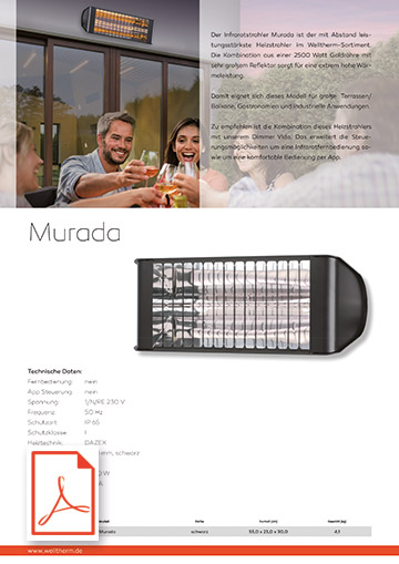 Der Infrarotstrahler Murada ist der mit Abstand leistungsstärkste Heizstrahler im Welltherm-Sortiment. Die Kombination aus einer 2.500 Watt Goldröhre mit sehr großem Reflektor sorgt für eine extrem hohe Wärmeleistung.